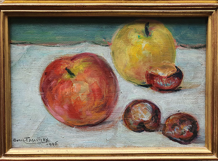 APPLES AND GRAPES, 1997, oil on canvas board, 13 x 16,1 in